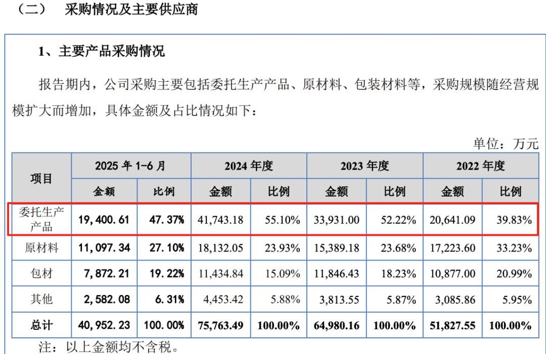 招股书数据显示,英氏控股对外委托出产的依赖度一曲较高:按采购金额计,委托出产产物占比由2022年的39。83%上升至2024年的55。10%。虽然后因湖南浏阳自建出产投产,2025年上半年委托出产占比回落至47。37%,但总体而言近半产物仍由代工场出产。