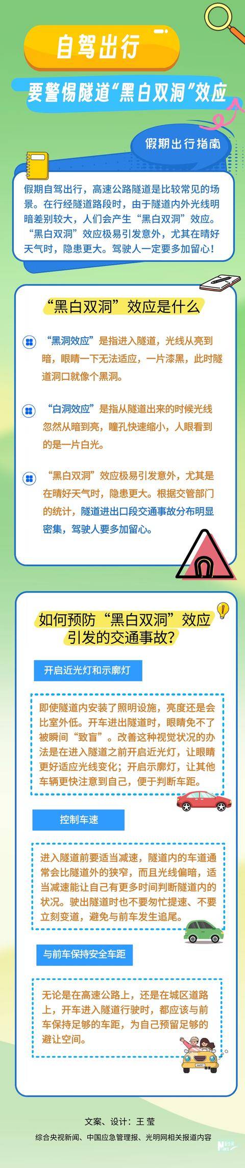中秋假期,自驾逛热度不减。交通运输部预测,自驾仍然是此次假期出行的次要体例。自驾出行将达到18。7亿人次,占出行总量的八成摆布。高峰时段,高速公车流量可能会冲破日均7000万辆,此中假期气候好、景色美,正在山海之间畅玩时,平安也不克不及轻忽。收下这份自驾出行平安指南,让旅途更高兴。假期自驾出行,高速公地道是比力常见的场景。外行经地道段时,因为地道表里光线明暗不同较大,人们会发生“口角双洞”效应。“口角双洞”效应极易激发不测,特别是正在晴好气候时,现患更大。按照交管部分的统计,地道进出口段交通变乱分布较着稠密,驾驶人要多加留神。